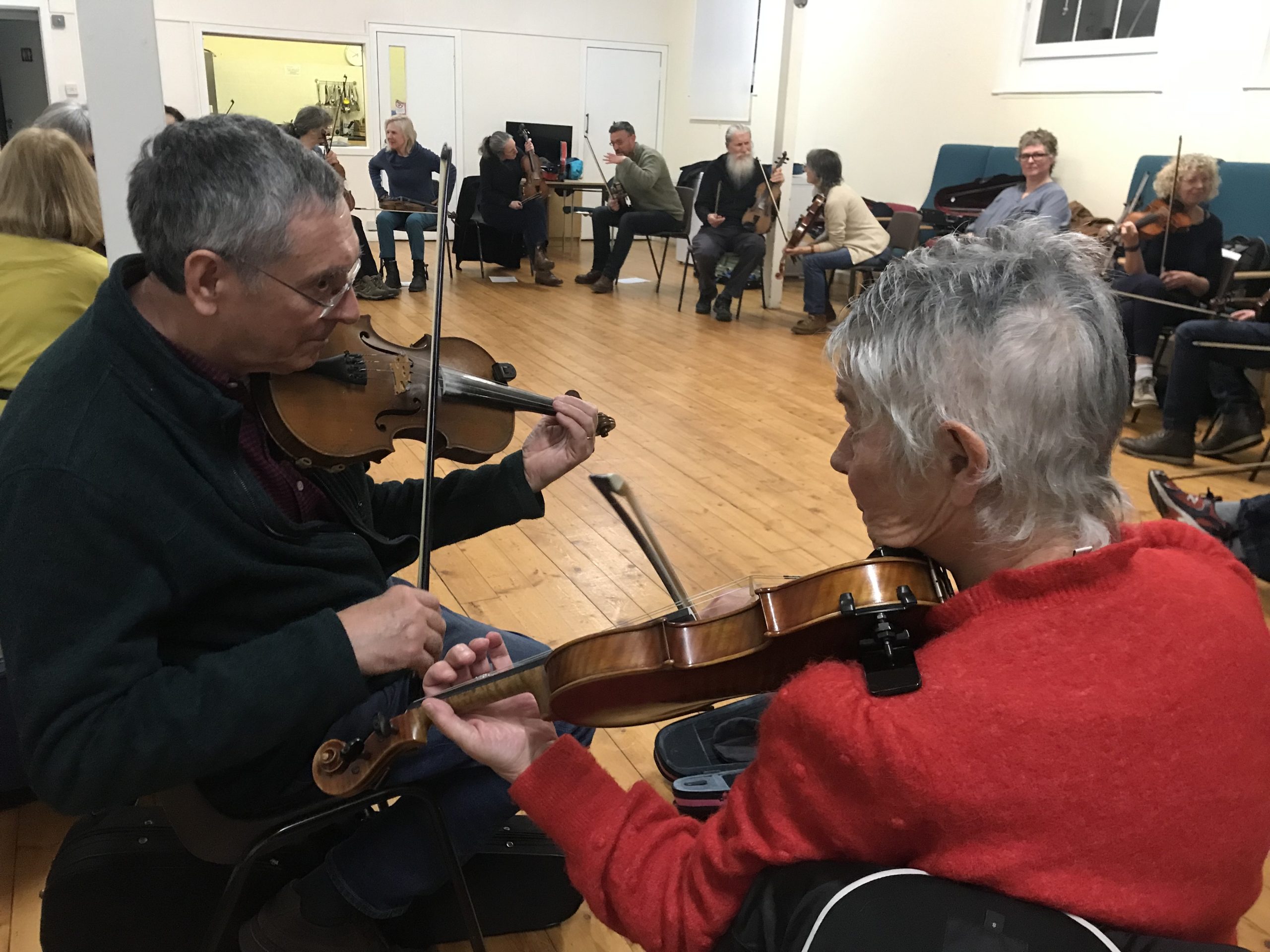 The focus is on learning by ear, it doesn’t matter if you read music or not. The genre is mainly Scottish folk, with some European/ Americana / Scandinavian tunes thrown in too. As a part of learning new tunes and consolidating familiar ones, depending on your level, there is always attention to building a good grounding in basic technique, digging deeper to improve your sound, learn ornamentation, hot tips on bowing, tone, and musicality. Learning the fiddle is a life long challenge which brings joy, frustration, and some good friends! If you’re new to Fun Fiddle, we welcome you on the journey!